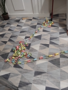 Řetěz byl tak dlouhý, že jsme chvíli přemýšleli, jestli ho nezapsat do Guinnessovy knihy rekordů. Nakonec jsme ho využili k ozdobení prostoru – a musíme uznat, že výsledek je parádní! Kromě toho se při výrobě ozýval smích, padaly nápady a občas i papírové kroužky na zem (ale to k tomu patří).