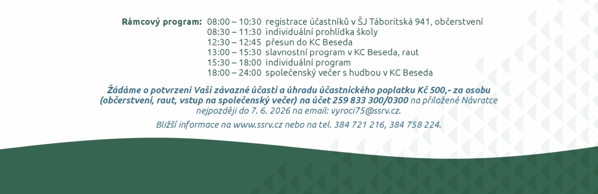 Žádáme o potvrzení Vaší závazné účasti a úhradu účastnického poplatku Kč 500,- za osobu (občerstvení, raut, vstup na společenský večer) na účet 259 833 300/0300 na přiložené Návratce nejpozději do 7. 6. 2026 na email: vyroci75@ssrv.cz